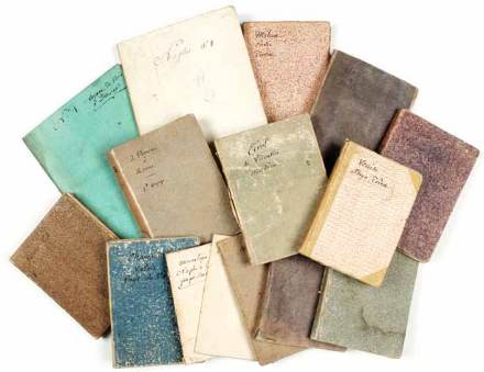 1150 pages (plus des ff blancs) en 11 carnets in-12 cartonnés plus 2 brochés et 7 cahiers petit in-4 dont un avec couv.