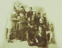 Photographie originale des artistes du Chat Noir, vers 1890. Les artistes s’amusent autour de Salis au centre, le seul à regarder
