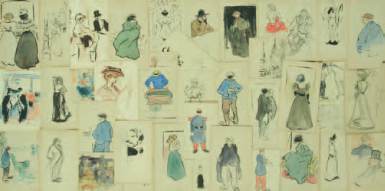 ou aux crayons de couleurs (scènes de cabaret ou de caf-conc’, portraits, élégantes, études de personnages…)