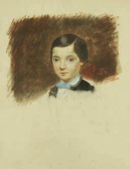 Tête de jeune garçon, de face, en veste noire et cravate bleu ciel, sur fond marron. Il s’agit très probablement d’un portrait