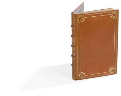 (2 ff.), couverture illustrée. Maroquin havane, plats ornés d’un encadrement de trois filets dorés et de motifs floraux aux