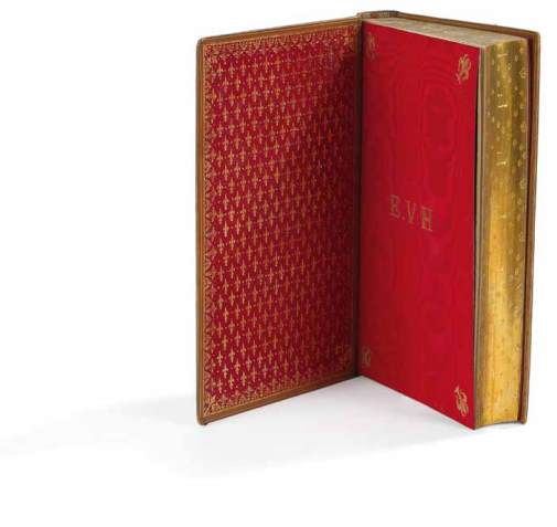 papier dominoté en or sur fond bordeaux, tranches dorées et ciselées ornées d’un décor de fleurs de lys et du “ L” de