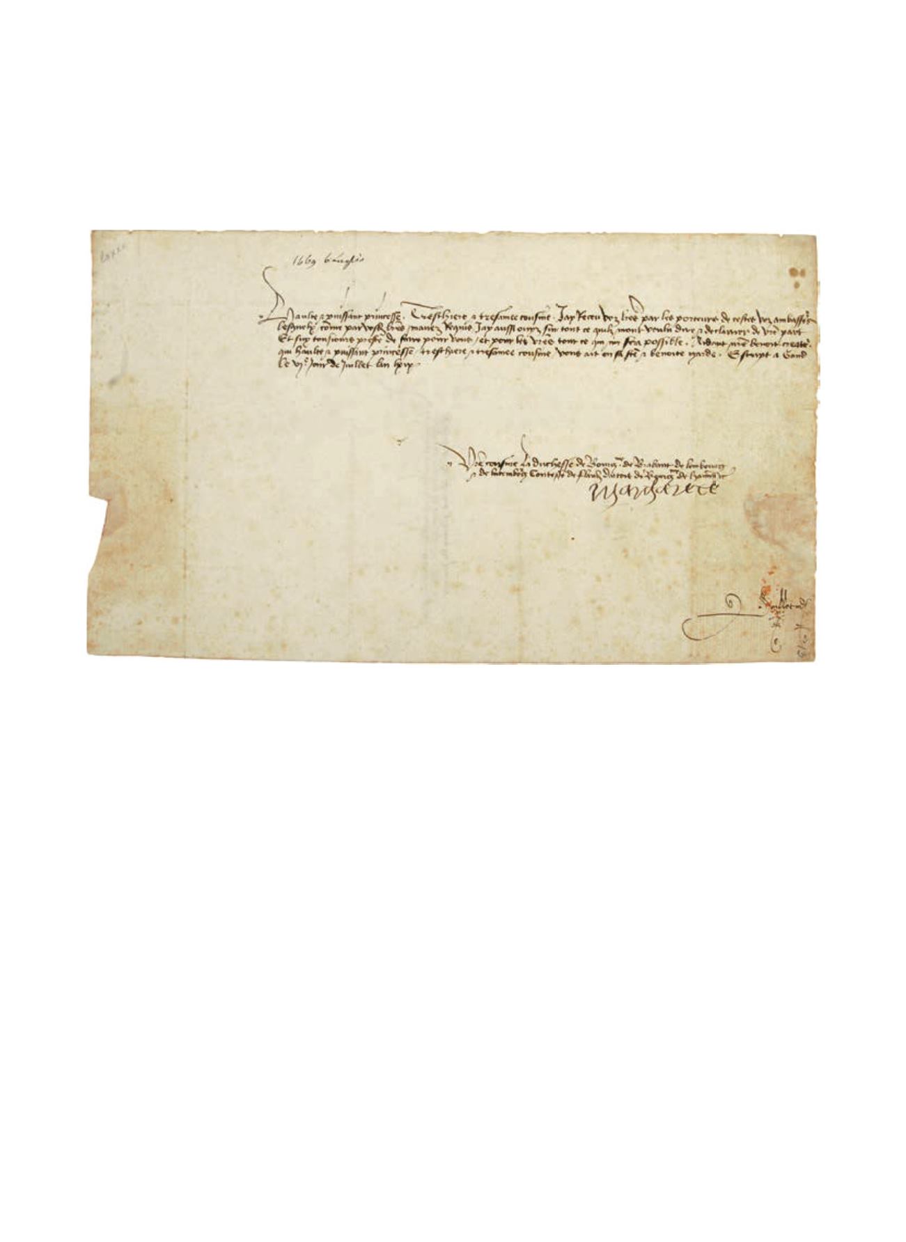 Lettre signée « Margarete », Gand 6 juillet 1469, à la duchesse de M