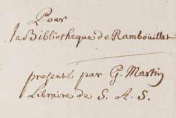 ex-dono autographe sur le premier feuillet de garde : “Pour la Bibliothèque de Ramboüillet,