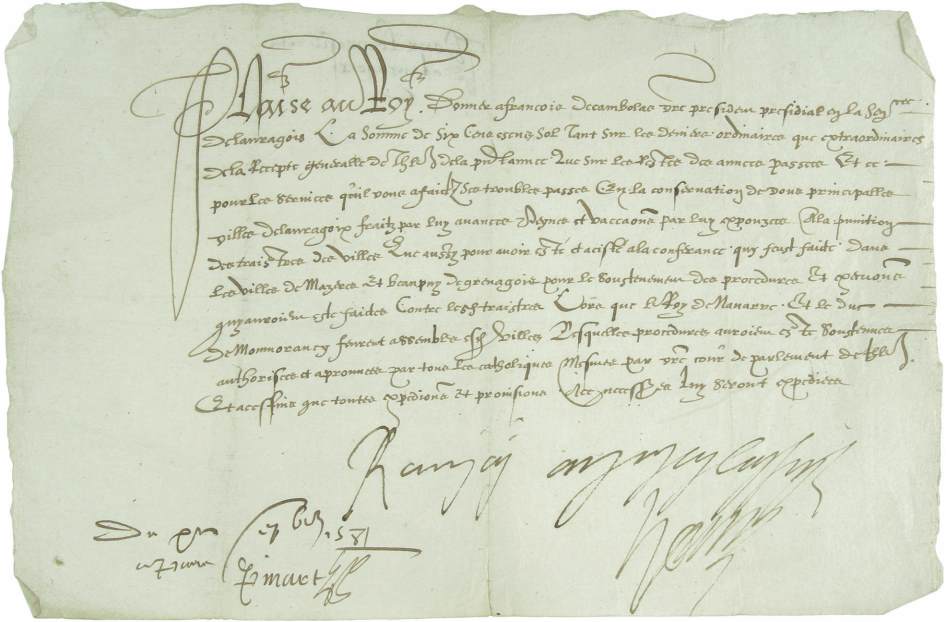 . P.S. avec une ligne autographe, 12 septembre 1581 ; contresignée par le secrétaire d’État Claude P