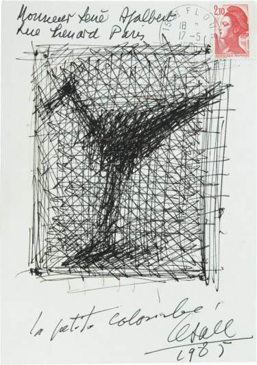 Dessin au stylo noir d’un oiseau en cage, légendé « La petite colombe », signé et daté 1985, avec l’adresse du destinataire.
