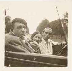 Photographie d’amateur : Poulenc, coiffé d’un béret, est assis dans une voiture, à côté de la cantatrice Suzanne Peignot
