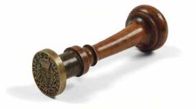 Cachet ovale en bronze des entrepôts de sel de Toulouse, monté sur bois tourné. Cachet
