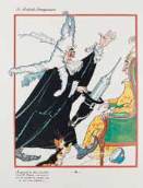 or, Argan dans un fauteuil entouré par deux médecins, gardes illustrées.