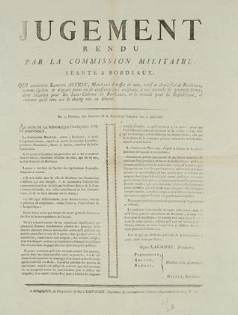 (imprimée) de Lacombe. Bel exemplaire de ce document sur l’activité du tribunal révolutionnaire de Bordeaux, où