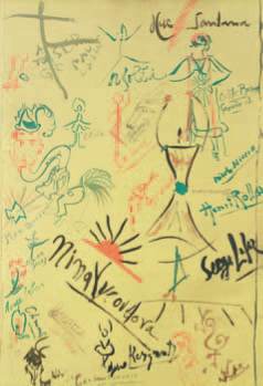 Environ 30 signatures, accompagnées de dessins, des chanteurs Huc Santana, Kenneth Spencer, Renée Lebas ; peintres et