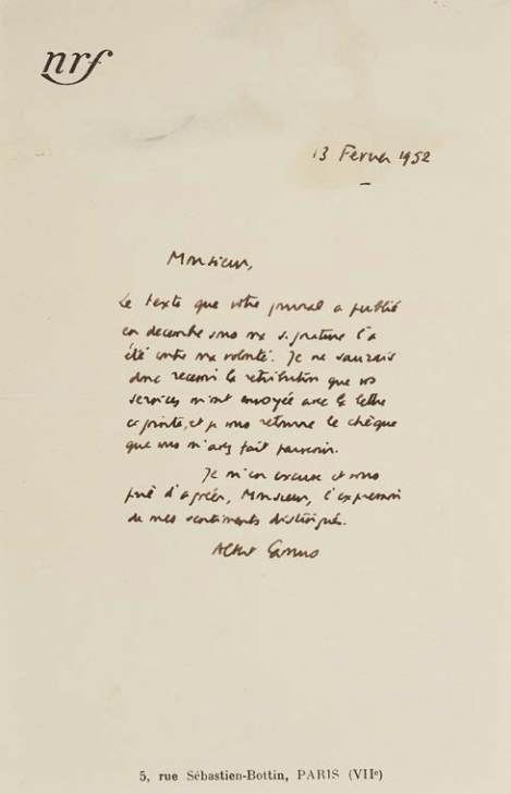 Écrivain français. Prix Nobel de littérature (1957). L.a.s. «