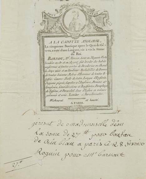 Reçu daté de Paris 28 février (v. 1780) d’une somme de 27 livres,