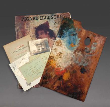 lui ayant appartenu, recouver te de restes de couleurs séchées, caractéristiques de sa peinture, 42 x 27 cm. Joint, un