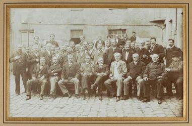 le montrant au milieu d’un groupe de ses collaborateurs, assis dans une cour devant un bâtiment.