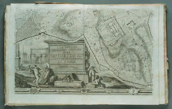 Jean-Baptiste Nolli (1692-1756), ingénieur, architecte et cartographe, œuvra à partir de 1736 à l’élaboration d’un plan moderne et détaillé de la ville de Rome, tandis que la plupart des grandes capitales européennes possédaient la leur. Pendant plusieurs années, il établit de nombreuses opérations de lever rigoureuses et scientifques, utilisant le procédé géodésique de triangulation, durant plusieurs années. Il intégra la nouvelle division de la ville en 14 quartiers, établie par le pape Benoît XIV en 1744, et acheva son travail en 1748, année de sa publication. Beaucoup de car tographes s’appuyèrent sur cette carte pendant de nombreuses années. EXEMPLAIRE STRICTEMENT COMPLET, DE TOUTE RARETE. Il contient le titre gravé, l’aver tissement au lecteur, un index alphabétique sur 4 feuillets, le plan de Rome (1708 x 2061mm) divisé en 12 feuillets, orné de belles compositions de Stéphane Pozzi, et les deux plans de Rome souvent manquants : un plan général réduit, et l’autre représentant la Rome ancienne par Bufalino (daté 1551).