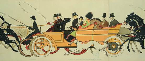 voitures allant au bois. Légende en bas des feuillets: “la “Mercedes” des