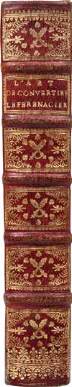in-4°, maroquin rouge, filets dorés autour des plats, armes au centre, dos à nerfs orné de pièces d’armes
