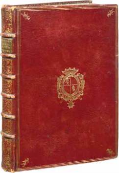 rouge, filets dorés autour des plats avec pièce d’armes en angle, armes au centre, dos à nerfs orné de même, tranches