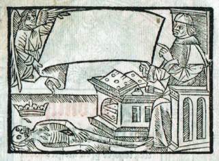 se trouve une figure sur bois représentant le cadavre du roi gisant à côté du pupitre de l’auteur, lequel montre du doigt un
