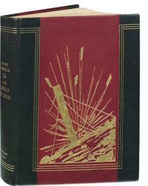 d’un large fer doré représentant une ligne de fils de fer barbelés et une explosion au second plan, dos lisse, étui (