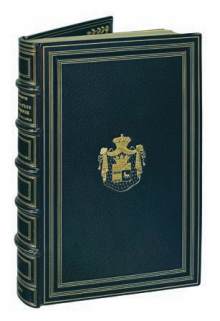 en encadrement avec armoiries au centre, dos à nerfs ornés de filets dorés, tranches dorées sur témoins, doublure de