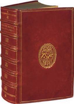 rouge, triple filet doré, dos lisse orné, pièce de titre verte, tranches dorées (