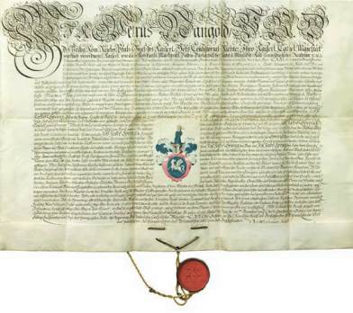 56 [HÉRALDIQUE]. Diplôme manuscrit de concession d’armoiries par le Saint-Empire à Johann Jakob Spreng, père