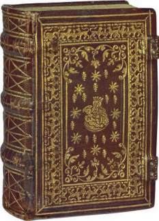 Petit in-8 (130 x 90 mm), maroquin brun sur ais de bois, filets dorés et bordure de léopards et de vasques en