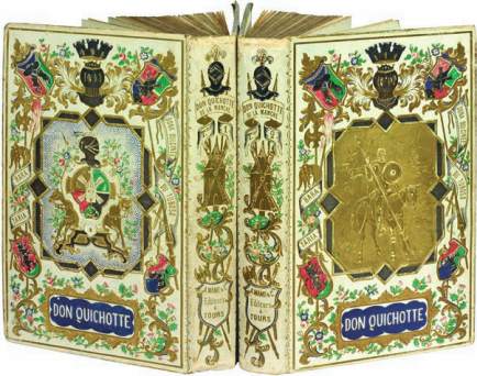 rinceaux et volutes à froid en encadrement, plats illustrés de personnages dorés et polychromes, dos long orné de