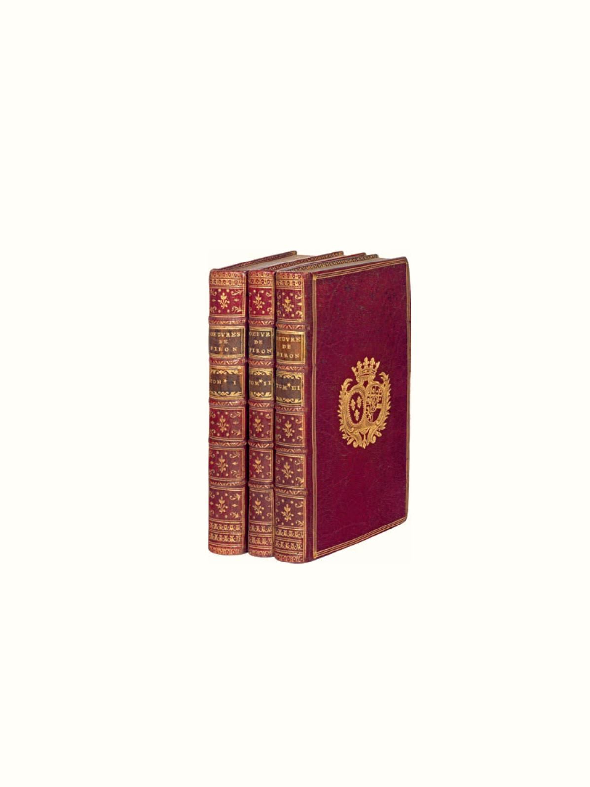 3 volumes in-12, maroquin rouge, triple filet doré, armoiries au