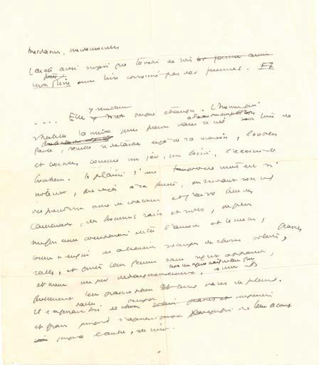 2 ff. in-4 pelure. S.d. [déc. 1931]. Brouillon corrigé. Le 4 décembre 1931, le Prix Femina est décerné à Saint-Exupéry pour « Vol de nuit ». Le jury du prix étant composé exclusivement de femmes, Saint-Exupéry se dit presque surpris qu’elles lui ait donné leur préférence : « J’ai été aussi surpris que touché de voir mon livre aussi bien couronné par des femmes », dit-il. Sa sur-prise vient du fait que les femmes « semblent presque étrangères » à son roman :