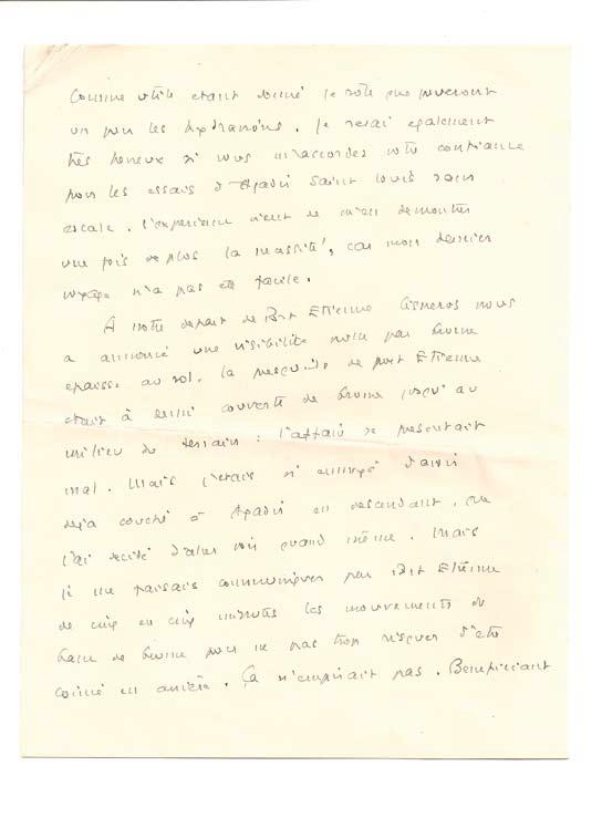 6 p. in-8. Casablanca, s.d., mais fin 1931, quand Saint-Exupéry assure la liaison Casablanca – Port-Etienne de la ligne d’Amérique du Sud, avant d’être affecté à la ligne d’hydravions Marseille-Alger en 1932 (« Vous savez que vous me ferez une bien grande joie si vous me faites entrainer à mon retour sur la ligne Marseille-Alger »).