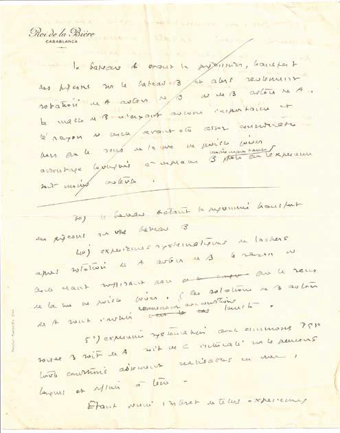 2 p. in-4 à en-tête de la brasserie « Le Roi de la Bière » à Casablanca. S.d., vers 1927-1930. Les pilotes de l’Aéropostale allaient se détendre à la terrasse du Roi de la Bière : Guyemer, Mer-moz, Saint Exupéry, etc. L’écrivain s’adresse à l’auteur d’un ouvrage intitulé Les secrets de la vie pour lui donner des conseils sur des expé-riences à mener sur la colombophilie :