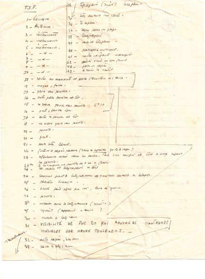 Le découpage est sur une page, numéroté de 1 à 43, styles très rythmés accentuant l’inquiétude de la scène, qui se passe entre les bureaux de la compagnie et l’avion le lien s’effectue par la TSF. Nous retrouvons les situations de Vol de nuit, quand la femme de Fabien attend angoissée des nouvelles de son mari et que Rivière sait pour combien de temps il peut encore voler. Ebauche d’une possible adaptation du livre pour le cinéma, incroyable vestige de Saint-Exupéry cinéaste.