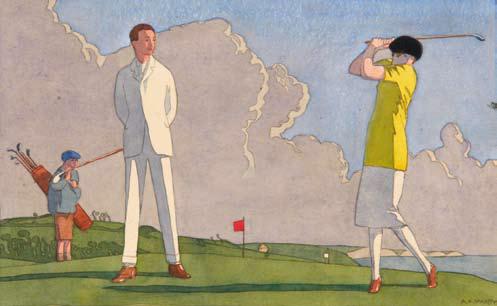 Collection Pierre Corrard, 1919 (1921). Portfolio gr. in-4, plat illustré, rabats en papier illustré et coloré, lacets, dos vélin au titre doré. Illustré de 12 aquarelles d’André Marty reproduites au pochoir. Tirage limité à 300 ex., celui-ci 1/12 ex. réimposés sur grand papier du Japon des manufactures de Shidzuoka (1er papier), comportant une AQUARELLE ORIGINALE, signée et titrée (ex. n° 4, aquarelle n° 4), ayant servi à l’illustration de l’ouvrage, et une suite en noir. Douze pensées de Tristan Bernard. Typographie de Coulouma, mis en couleurs par Jean Saudé. Dos vélin refait, rangé dans un étui couvert de soie verte (Jon Buller).