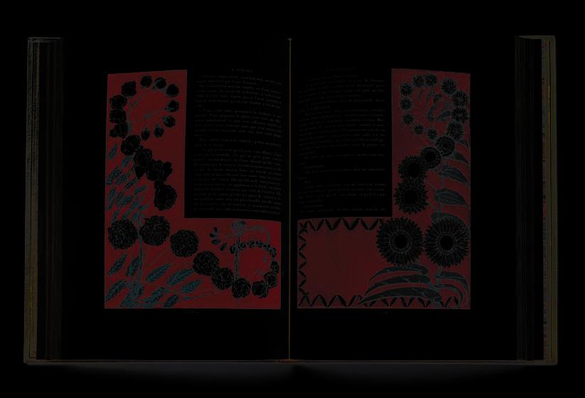 Les Bibliophiles contemporains, 1894. In-4, plein maroquin aux plats vert, dos à 5 nerfs, nom de l’auteur et titre poussés or, décor mosaïqué d’un encadrement du titre formé de branches de chardon, contreplats encadrés de 9 filets, doré sur tranches, doublures de soie, chemise (Marius MICHEL). Tirage limité à 180 ex., celui-ci n° B, sans nom du Sociétaire. Papier avec un très beau filigrane en marges (frise florale, nom de l’auteur et du titre), conçu par Octave Uzanne, le directeur fondateur de la Société de l’Académie des Beaux Livres. Illustré de 4 magnifiques compositions en couleurs aquarellées au pochoir de Léon RUDNICKI pour la couverture, la page de titre, le faux-titre et la justification illustrés. Chacun des 4 contes est illustré par un artiste différent :