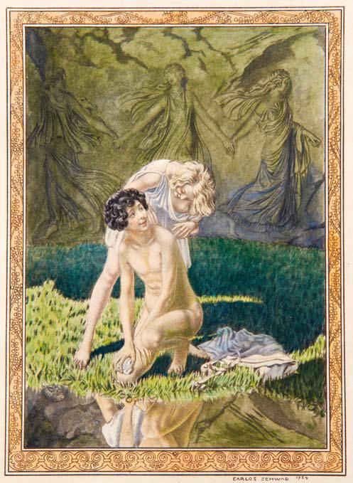 Charles Meunier, 1908. In-4, bradel de papier marbré marron, titre et auteur dorés, couverture conservée. Illustrations de Carlos Schwabe : 45 compositions à figures, tirées en gris en tête de chaque chapitre, 42 culs-de-lampe, encadrements floraux. Tirage limité à 166 ex., celui-ci 1/100 ex. sur vélin blanc Périgit-Masure (n° 109).