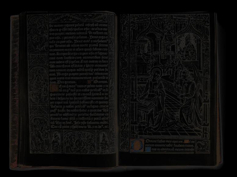 – feuillet d 5 v° : Ad Primam ; – feuillet d 7 v° : Ad tertiam ; – feuillet e 1 v° : Ad sextam ; – feuillet e 3 v° : Ad nonam ; – feuillet e 5 v° : Ad vesperas ; – feuillet e 8 v° : Ad completoriú ; – feuillet f 7 v° : Sequuntur septem psalmi penitetia // les. ãn. Ne reminiscaris domine. ps . – feuillet g 8 v° : Sequuntur vigilie mortuorum Ad vespe // ras Antiphona. Placebo. Psalmus. ; – feuillet i 5 v° : Sequuntur suffragia plurimorú san // ctorum.