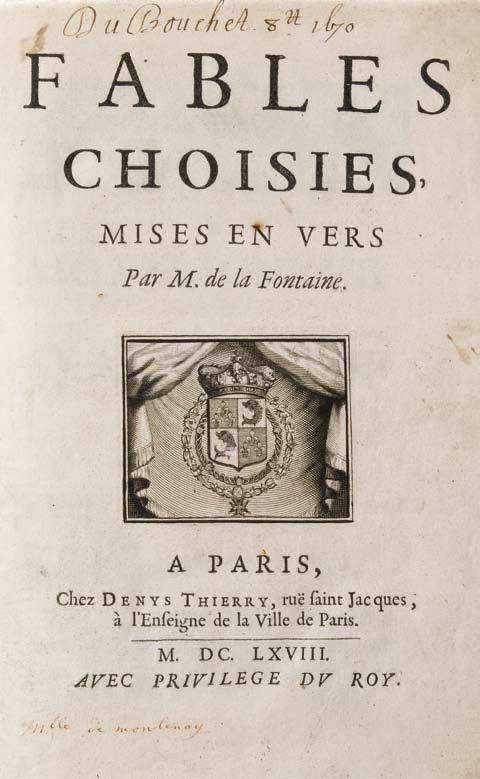 C’est, ici, l’édition originale du premier recueil des Fables dédiée au Grand Dauphin dont le privilège daté du 6 juin 1667 a été cédé pour moitié par le libraire Claude Barbin (ca. 1628-1698) à son confrère Denis II Thierry (16 ?-1712). Différente de l’édition courante publiée, la même année, en deux volumes au format in-douze, elle contient une épître dédicatoire, une préface, une Vie d’Ésope, une table et 124 fables.