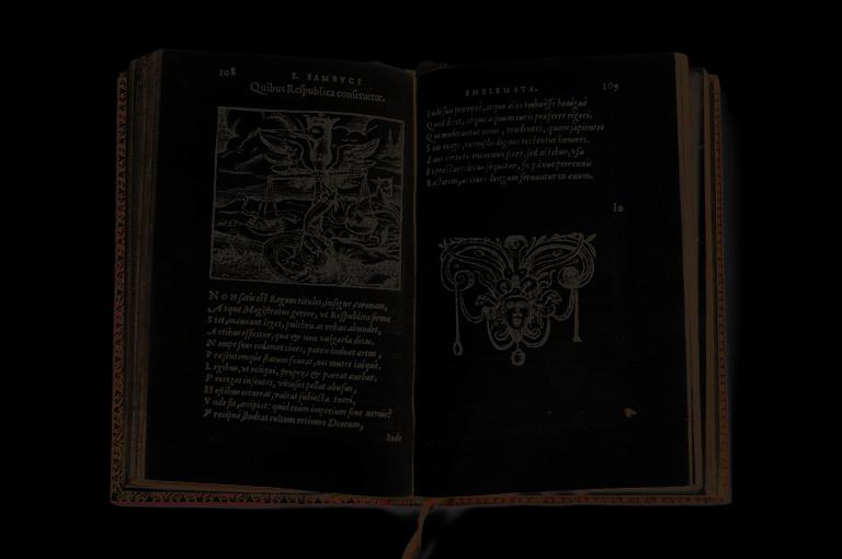 « Previous Page Table of Contents Next Page »Un portrait de l’auteur gravé sur bois, 222 bois gravés d’emblèmes, et 45 figures de médailles romaines (piles et faces), le tout gravé sur bois par A. Nicolai, C. Muller et G. van Kampen d’après Pieter Huys et Lucas de Heere. Marque typographique au titre. Trois emblèmes sont signés de la lettre C pour Cornelis Muller. Annotations manuscrites anciennes au recto du feuillet L 1 et au verso du dernier feuillet.