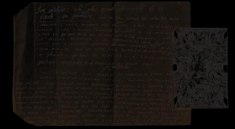 Vers 1961. Sur une enveloppe papier kraft in-4, écriture en lettres capitales. Texte absolument délirant et délicieux sur son invention de l’art, dans l’approximatif français dalinien : « La plus grande decouverte de ce ciecle en peinture elle est du a Salvador Dalu votre tres umble serviteur ; cette decoverte aurai pu haboir lieu a Def a moment ou Vermer arrive a l’apoge illusioniste et imitatif de la peinture a l’uile et au meme temps dans la meme ville de Def Languedoc invente la premier microscope - la tragedie la plus grande de la peinture ou lieu donc a ce moment supreme des deux conque-tes de la vision humaine sans que l’une puisse profiter de l’autre, que cet justement ce qui vient de realiser il ia 2 mois l’esprit jesuistique profiteur et tecnicien par excellence du divin Dali... » Un second texte suit, sur « La métode pour peindre un tableau a l’uile avec l’ilusion totalle de la troasieme dimension... » Capital ! Joint :