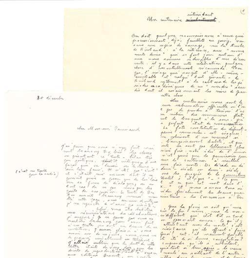 - Paul LEAUTAUD : 1 l.a. + l.t. 1 f. in-4, à en tête de la Bibliothèque Jacques Doucet. 1955. Impor-tante lettre tapuscrite signée de Léautaud qui en 1955, avait envoyé une copie dactylographiée de son journal à la Table Ronde, comportant de nombreux rajouts manuscrits inédits. Perte d’une partie de son journal littéraire. » Ce texte perdu du fait qu’il n’a pas été publié, ne peut être revendiqué, par l’éditeur, comme sa propriété. C’est à moi seul qu’il appartient et sa perte me cause un très grave préjudice. » / - ARAGON : 1 l.a.s. 1 f. in-4. Sur ses entretiens, veut revoir la copie. / - Michel DEON : 2 l.a.s. et 1 p.a.s. 1953. Sert d’intermédiaire entre Parinaud et Dali. « [...] un mot pour lui dire que « La Parisienne » était la meilleure revue du monde et qu’il se devait d’y collaborer. » / - BAZIN : 2 l.a. / - BEAUVOIR : 1 L. A. S. In-12, 2 p. « JE N’AI JAMAIS ETE VOIR LE PAPE» / - Alain BOSQUET : 1 l.a.s. / - René FALLET : 3 c.p. + 2 l.a. 1953 - 1957. Belle lettre de refus pour une demande de texte, il ne peut trahir « Le Canard ». « Puisqu’il s’agit d’ une chronique littéraire, c’est tendre au Canard un fanc pour qu’il me le blesse » [...] « J’écris un roman, mon chef-d’œuvre tout de délicatesse et d’amour et de Renaissance, un Grand Meaulnes femelle. Ca m’en tire des larmes d’admiration. » / - Jacques LAURENT : 2 l.a.s. 4 p. In-12. Le plan du numéro double de « La Parisienne » Textes prévus de Boris Vian, Cocteau, Blondin, Paul Léautaud, Hemingway ou Faulkner, Bachelard, Cioran... / - FOMBEURE : Ms., 4 p. et 1 l. / - Paul FORT : 3 l.a.s. 7 ff. In-12. 1952. Historique de la poésie par Paul Fort. / - Bernard FRANCK : Ms., 4 ff. in-4. Très beau texte sur André Parinaud. / - Pierre GAXOTTE : 3 l. / - GENEVOIX : 1 l.t.s. / - Julien GREEN : 2 l.a. + 2 l.t. / - Philippe HERIAT, : 1 l.t. / - Aldous HUXLEY, : 1 l.a. / - Jean de LA VARENDE (3 l.a.s. / - LANOUX : 2 l.a. / - MARTIN DU GARD : 1 l.a.s. / - MAX-POL FOUCHET : 1 l.a. / - Jacques PERRET : 2 l.a.s. / - Jules SUPERVIELLE : 1 l.a.s.