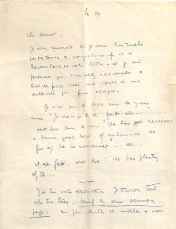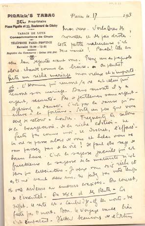 2 p. in-4. S.d. [20 mai 1934]. Signée L.F. Céline. Céline doit se rendre à Londres, et sera accompagné d’une « très jolie et bien intelli-gente danseuse russe », Muscha, inconnue des biographes. Parce que sa « vie nocturne n’est pas celle d’un gentleman » (il avait l’habitude d’aller dans les lieux de striptease populaires londoniens), il aura besoin « d’un véritable gentleman pour la night life de cette ravissante personne […]. Je crois d’ailleurs que le guide ne s’embêtera pas du tout. Toujours un peu maquereau par mes tendances, j’aime à rendre service […]. Je voudrais la rendre heureuse 15 jours ». Pour sa part, il compte écrire beau-coup : « Je travaillerai autant que possible. Je suis en plein rendement sur le second [roman, Mort à Crédit]. A propos, notre funny Voyage est un best-seller semble-t-il un peu partout aux U.S.A… J’espère que ça continuera. »