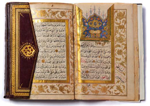 Deux frontispices et cartouches de titre inscrits en blanc sur fond de fines enluminu-res. Double page représentant la Mecque et Médine.