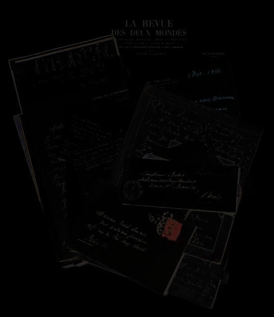 - Lettres reçues de : Paulin Limayrac (4), Prosper Duvergier de Hauranne (6 et 1 lettre de Buloz), Gyp (1), Saint-René Taillandier (5 L.A.S), Mali-tourne (1), Charles Magnin (2), Victor Cherbuliez (1), Alexandre Lavergne (7). Diverses lettres de correspondants étrangers. Plusieurs lettres sur un épisode important de la revue : la contrefa-çon belge ; plusieurs documents concernent les « industries qui alimentent la contrefaçon des livres français ». Une lettre dit notamment : « la Belgique n’a pas de mouvement intellectuel qui lui soit propre. Il n’y a pas de littérature belge, il y a à peine quelques écrivains belges.