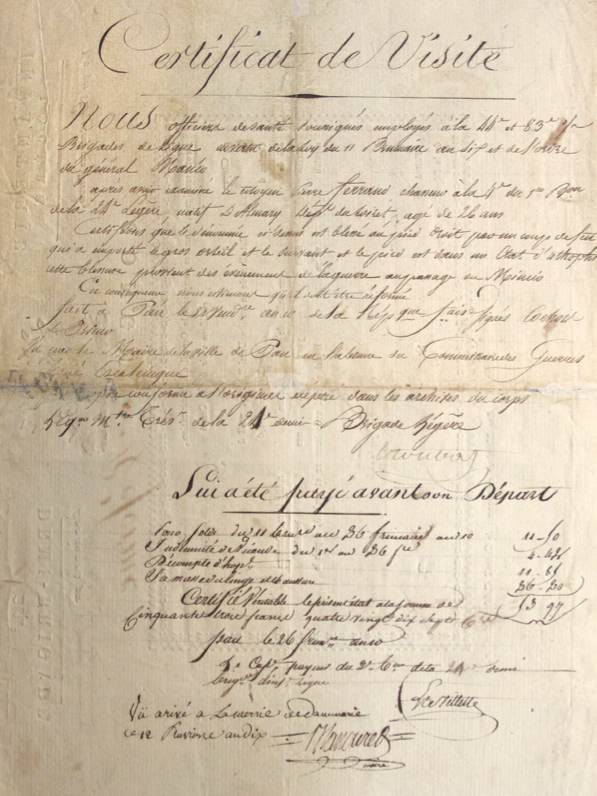 l’intérieur. Au verso le certificat de visite des officiers de santé, le détail