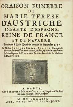 Recueil de 12 oraisons funèbres de Marie-Thérèse d’Autriche, très pieuse épouse de Louis XIV, qui mourut en 1683.