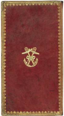 en angle dans les caissons, pièce de titre rouge, doublure de maroquin rouge avec emblème poussé au centre, dentelle