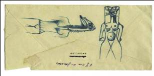 Dessin original à l’encre bleue figurant deux femmes à têtes animales au verso d’une enveloppe qui lui est adressée.